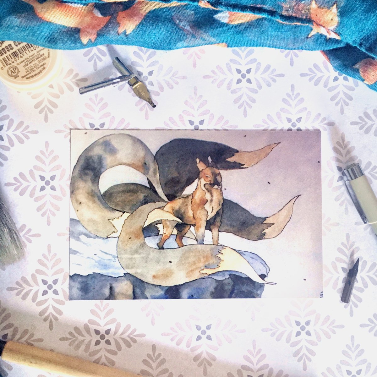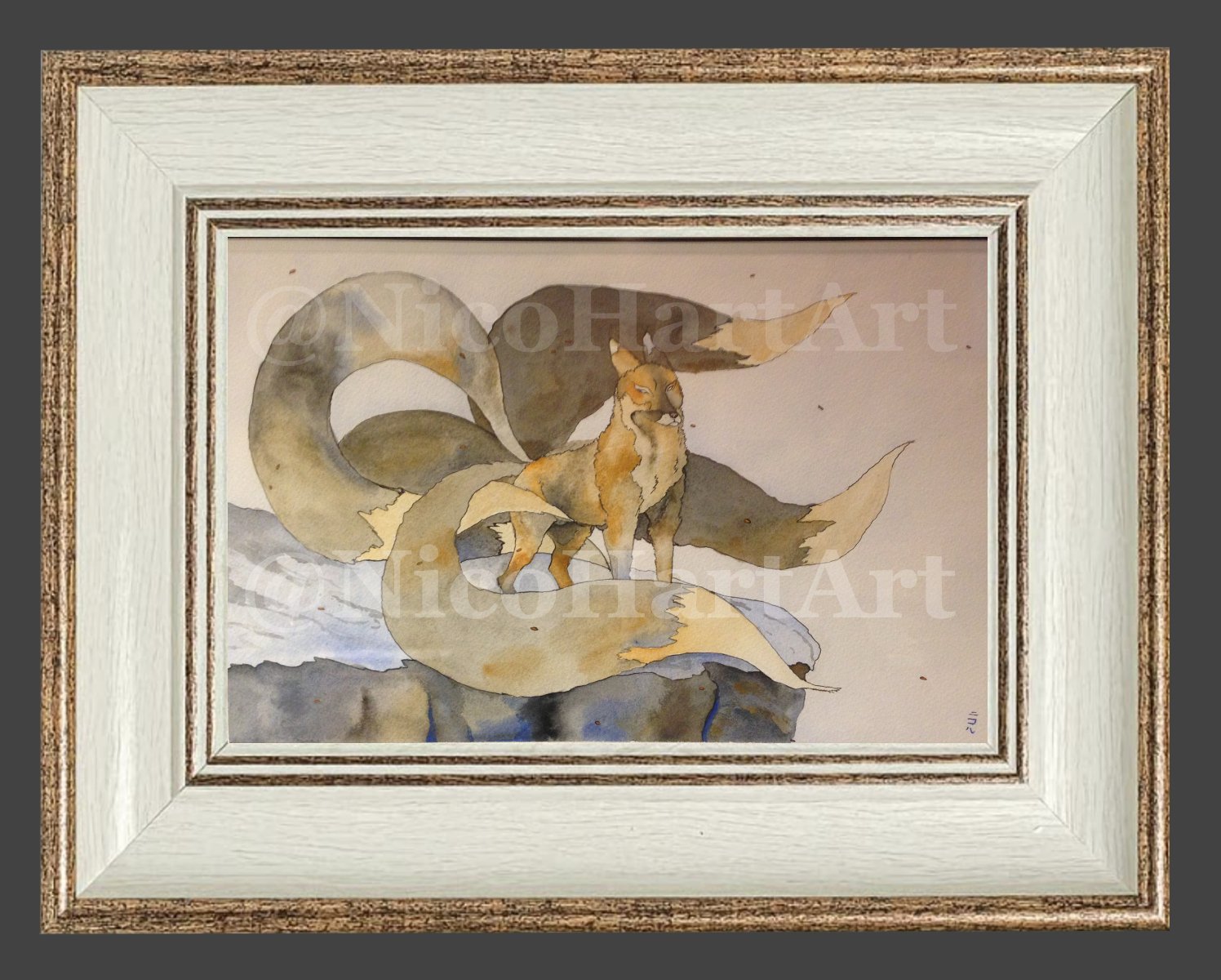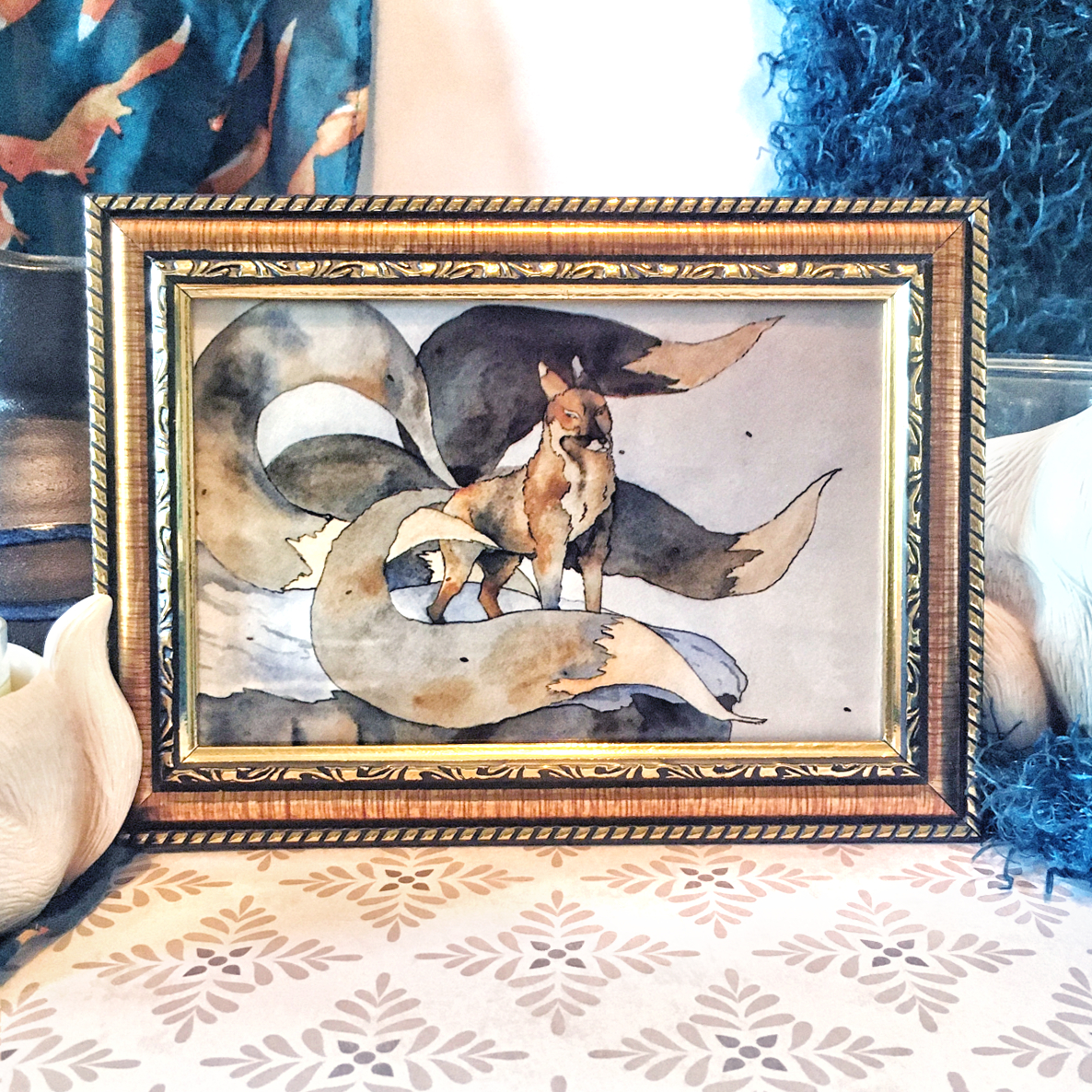Reproduction print of an original watercolor of a Five-tailed fox watching over its territory.