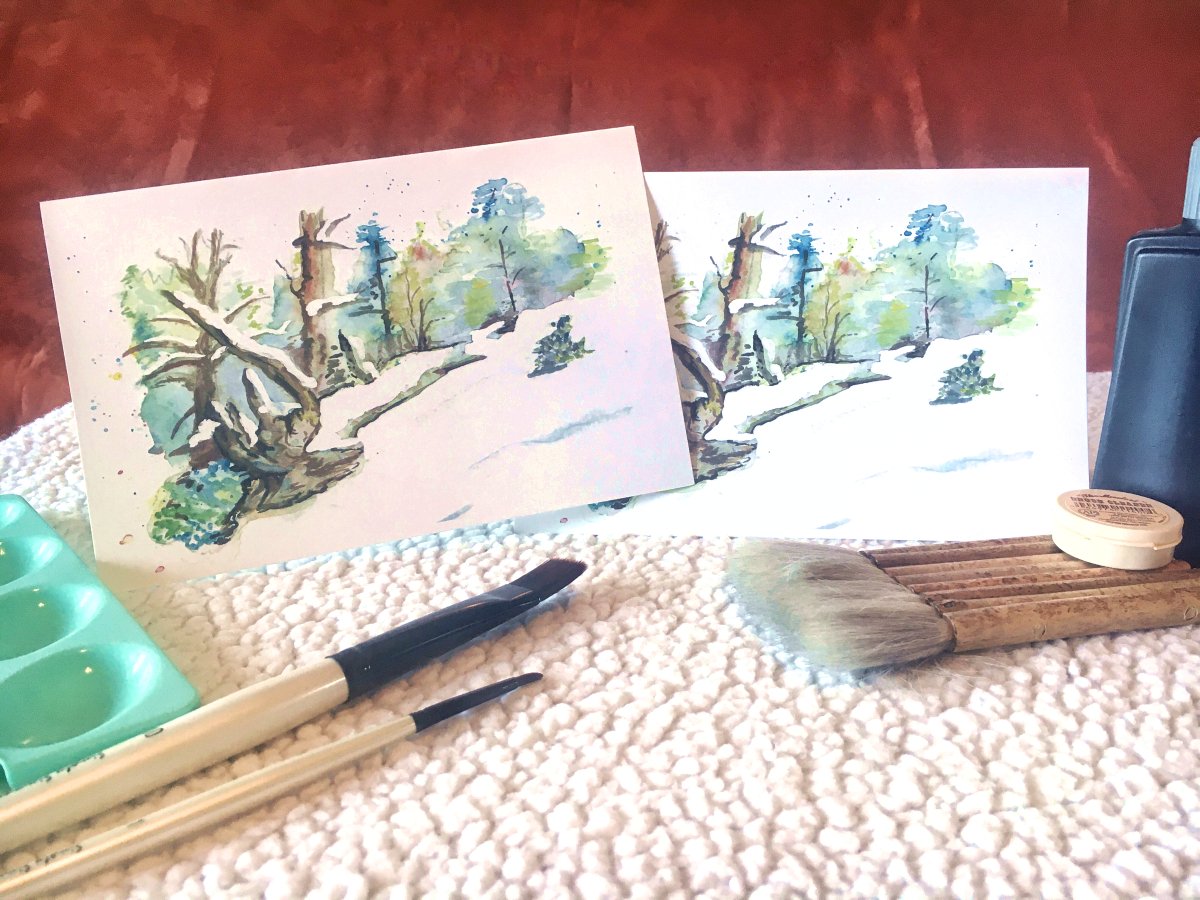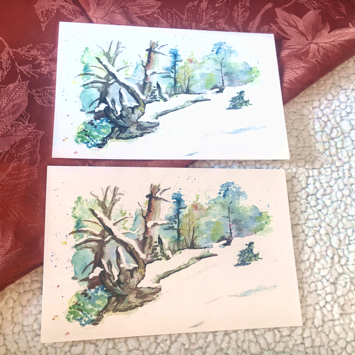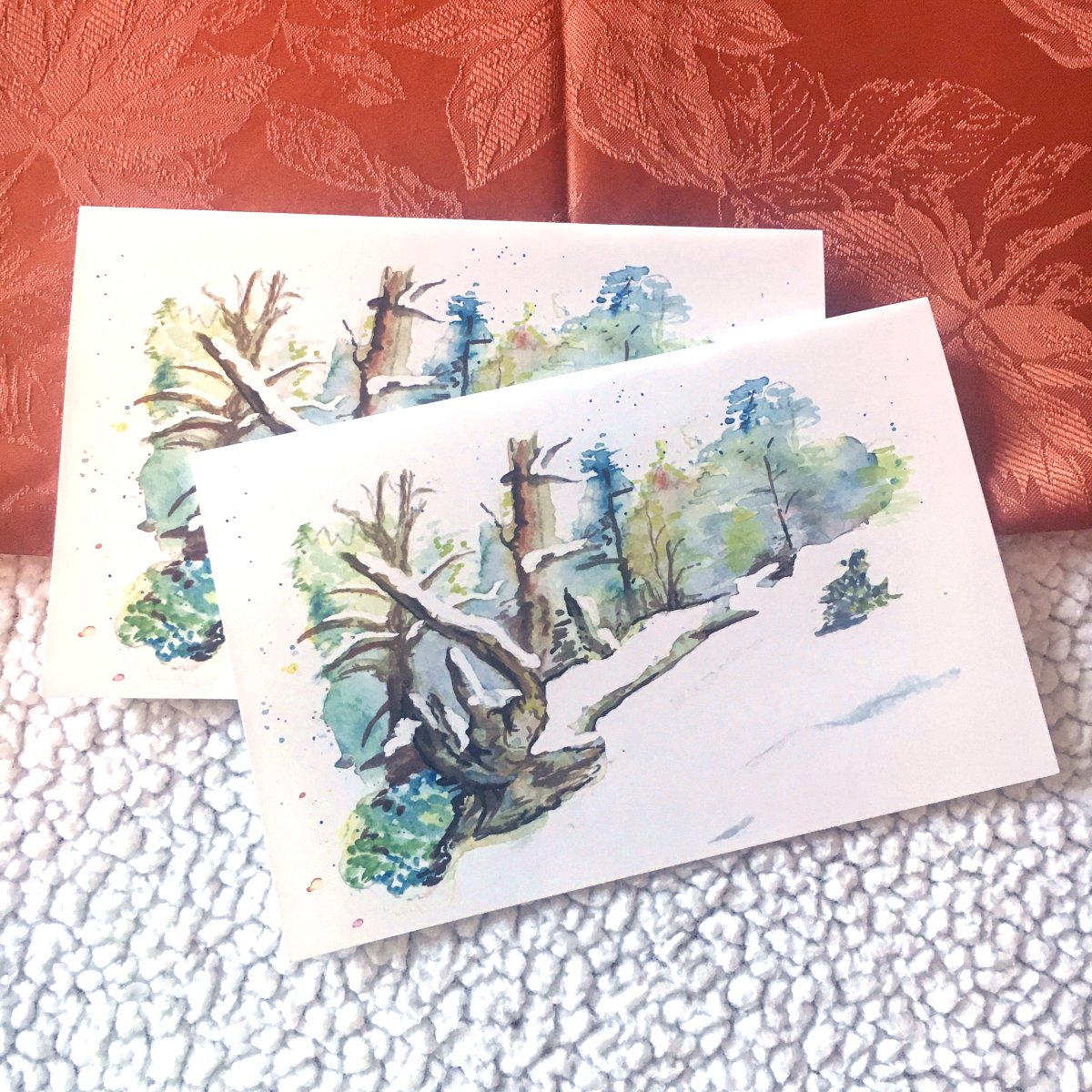 Folded blank Holiday cards with a watercolor winter scene on the front and small signature on the back.
