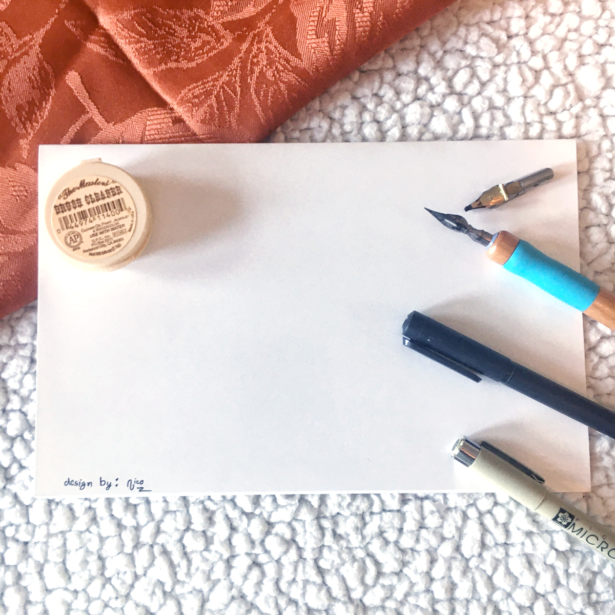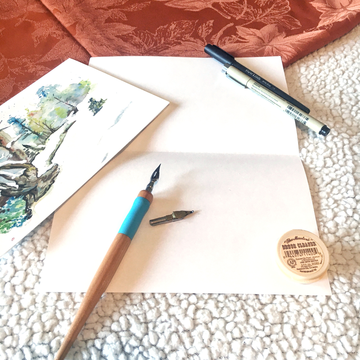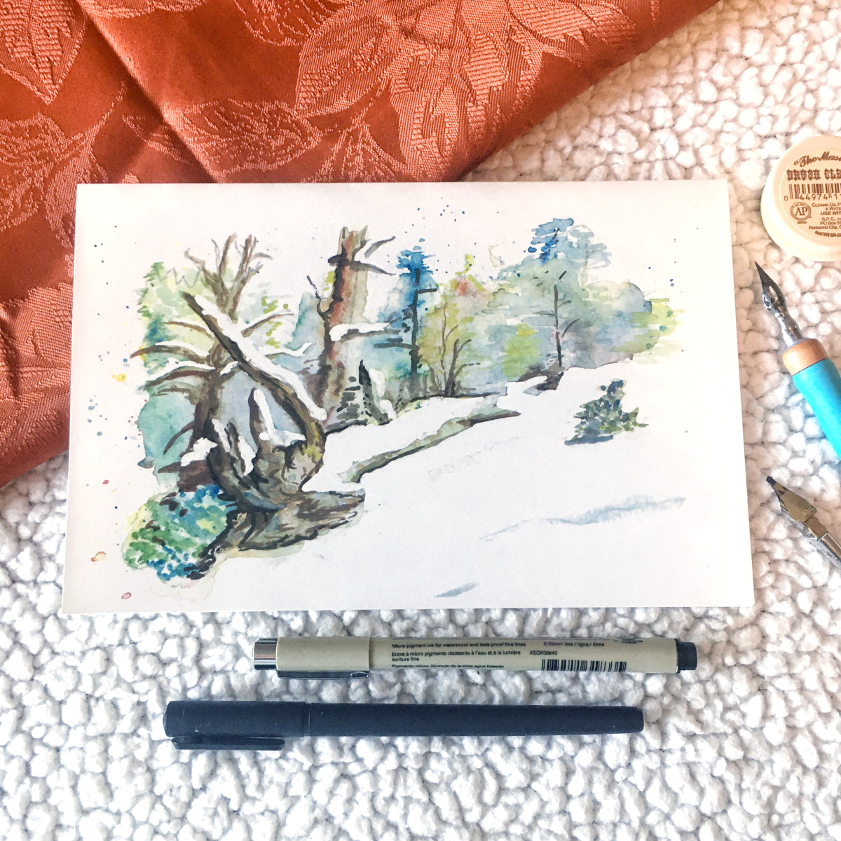 Folded blank Holiday cards with a watercolor winter scene on the front and small signature on the back.
