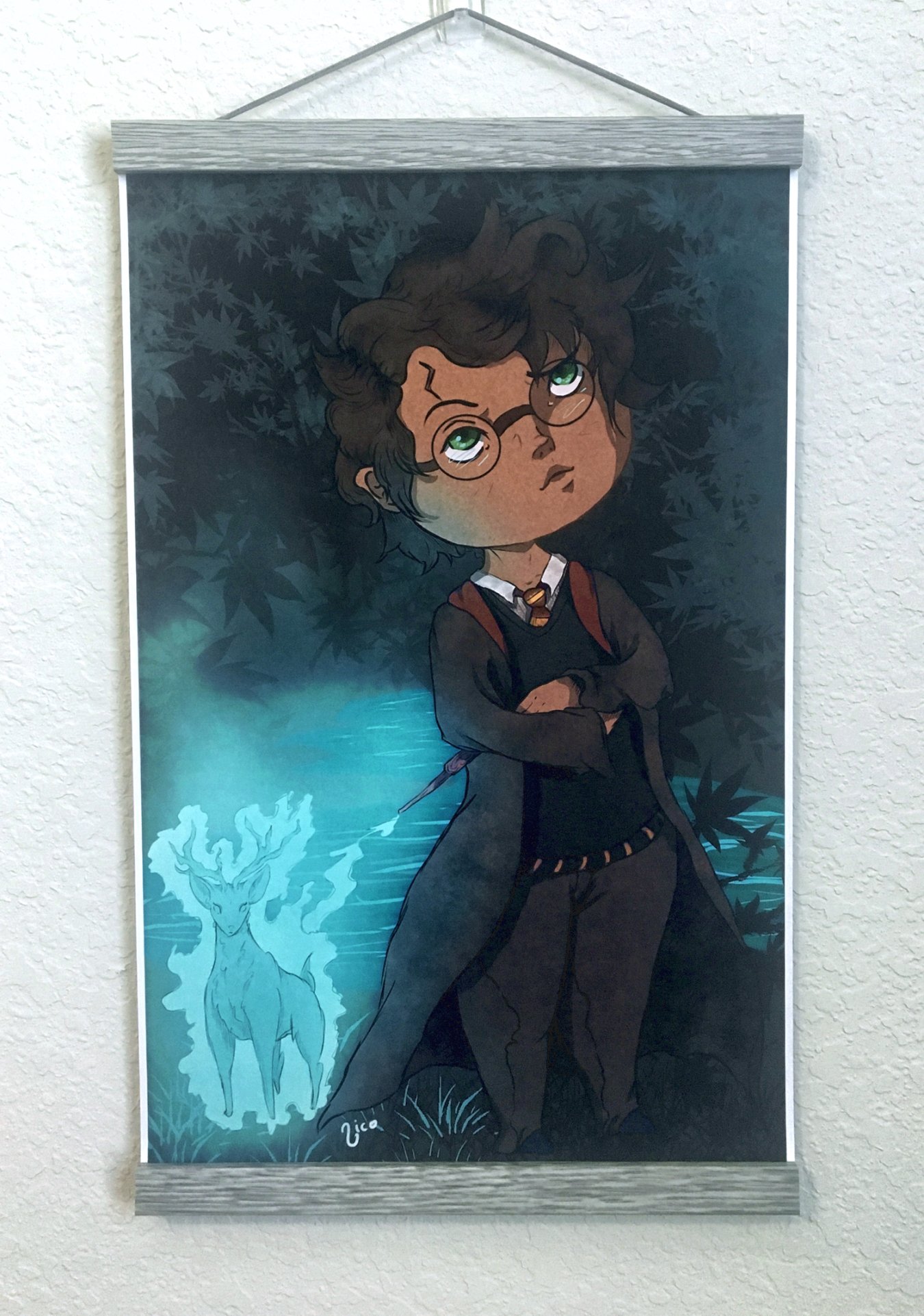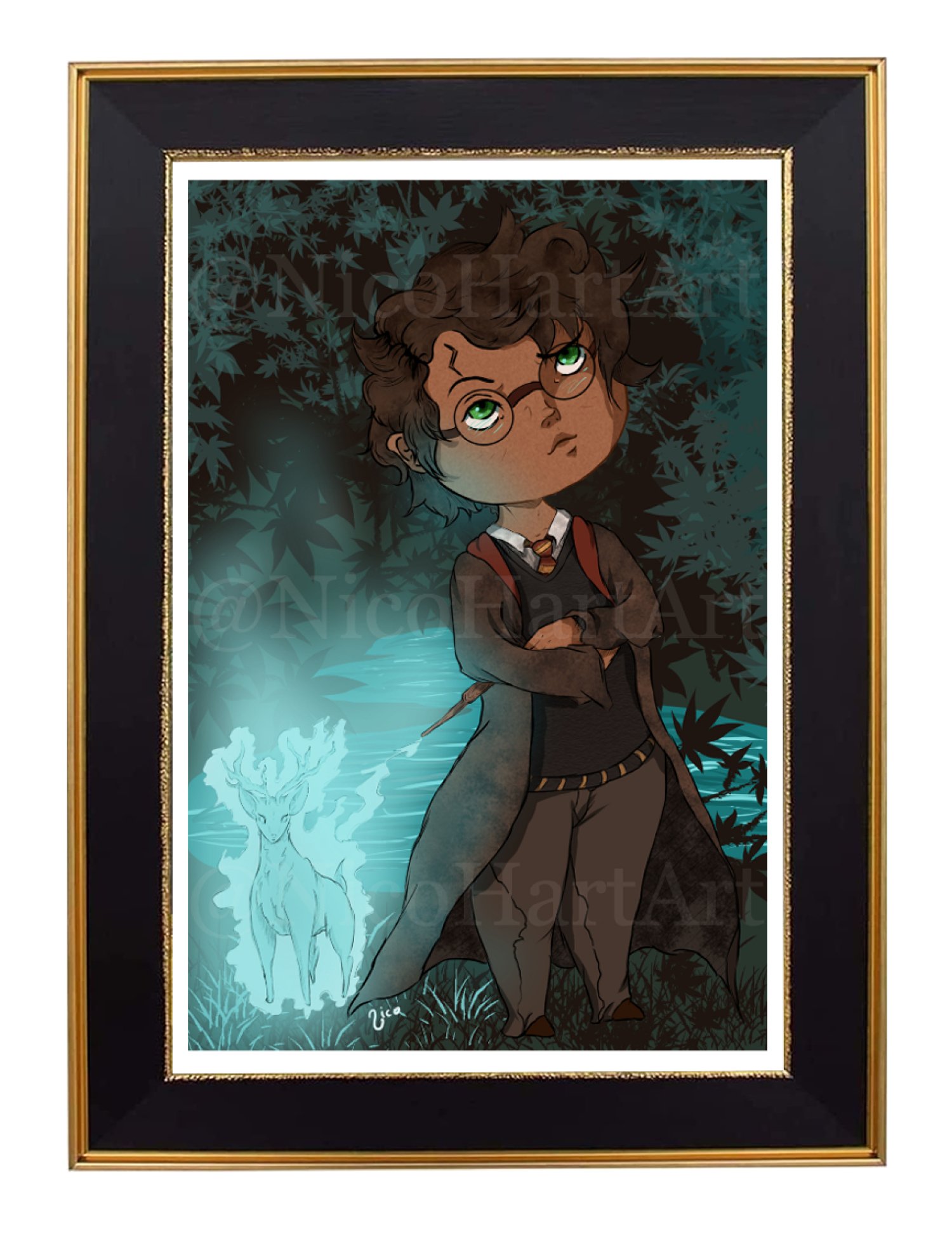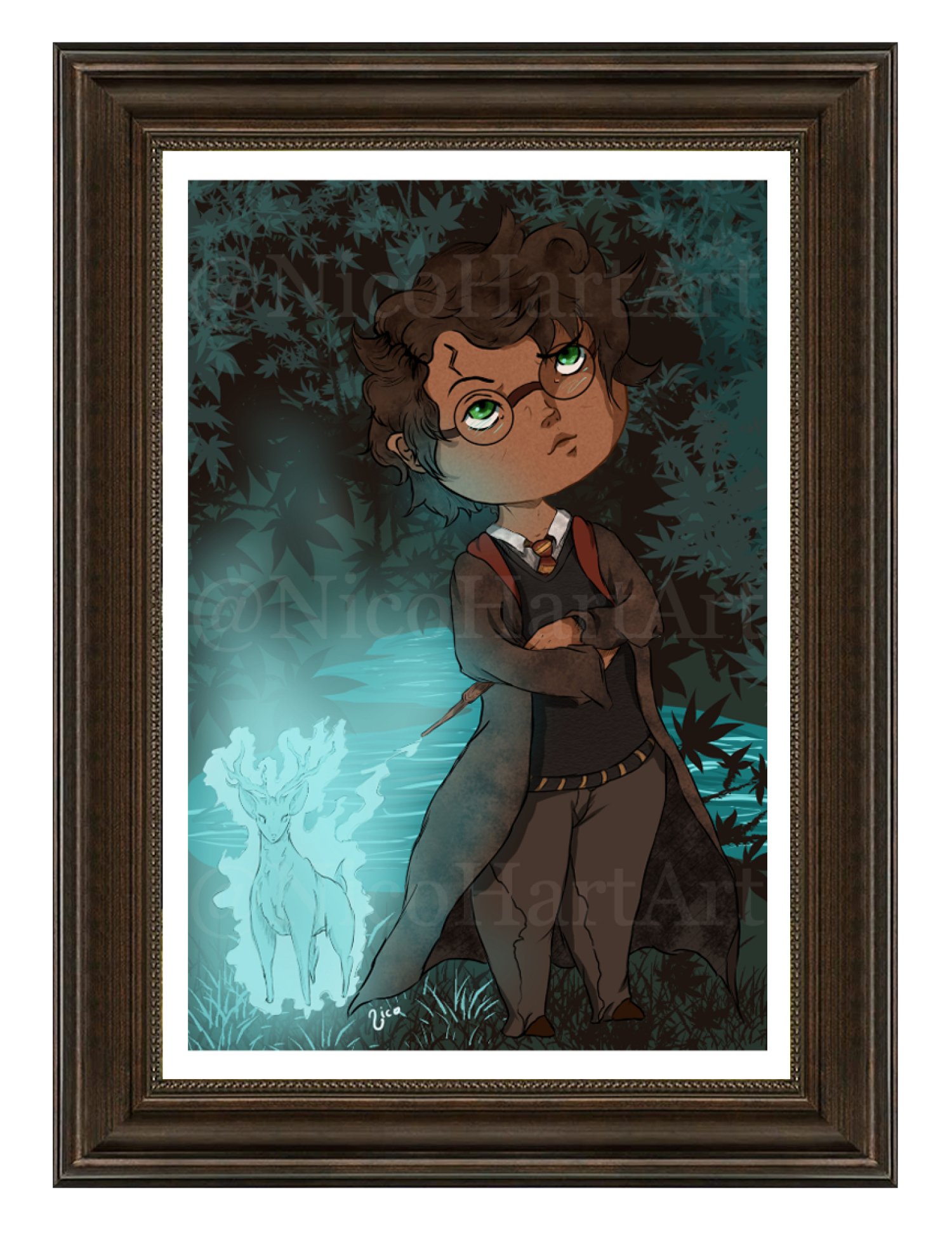 Harry and his stag patronus deep in the forbidden forest. Done in colors to match Draco as a pair.