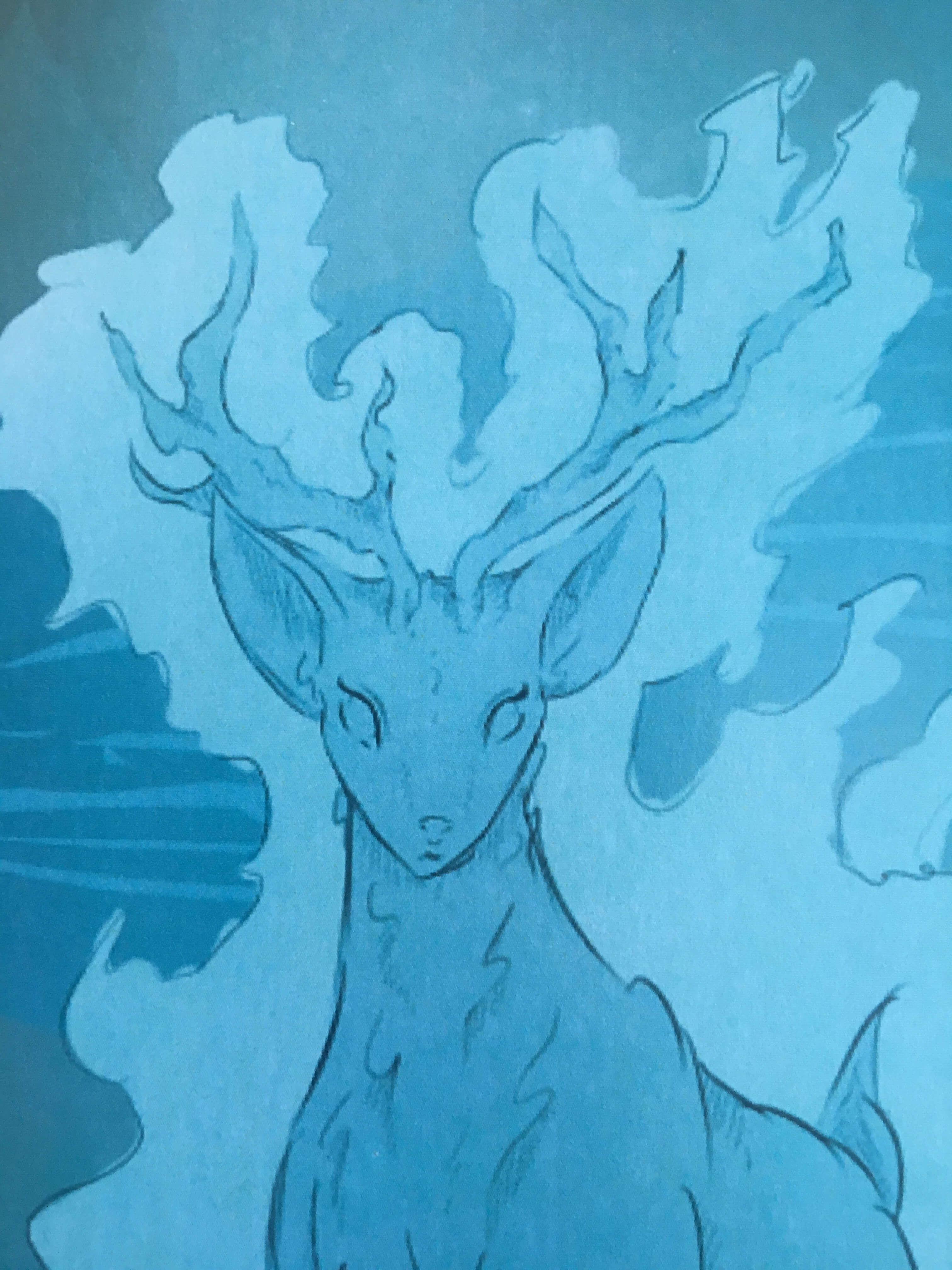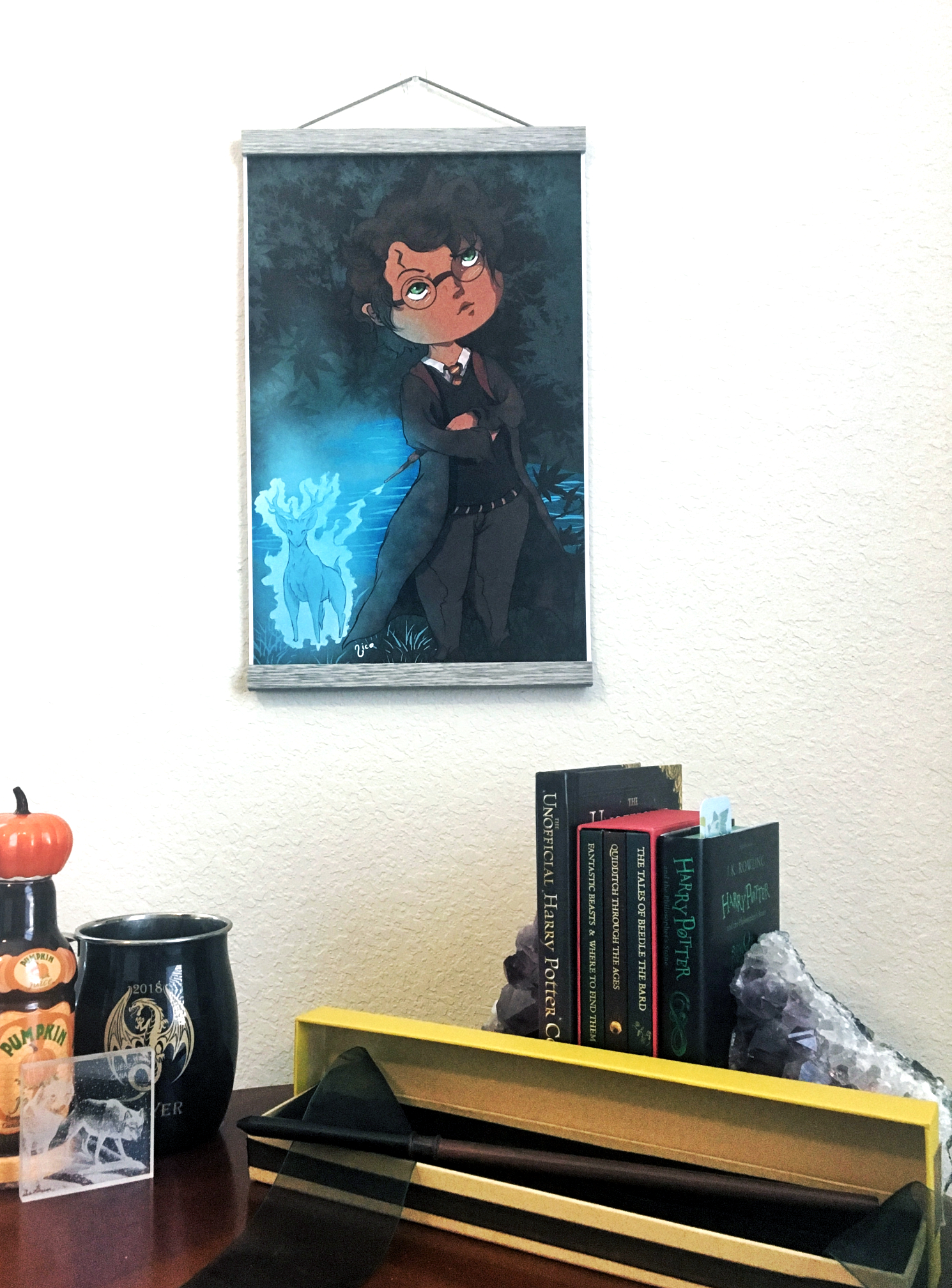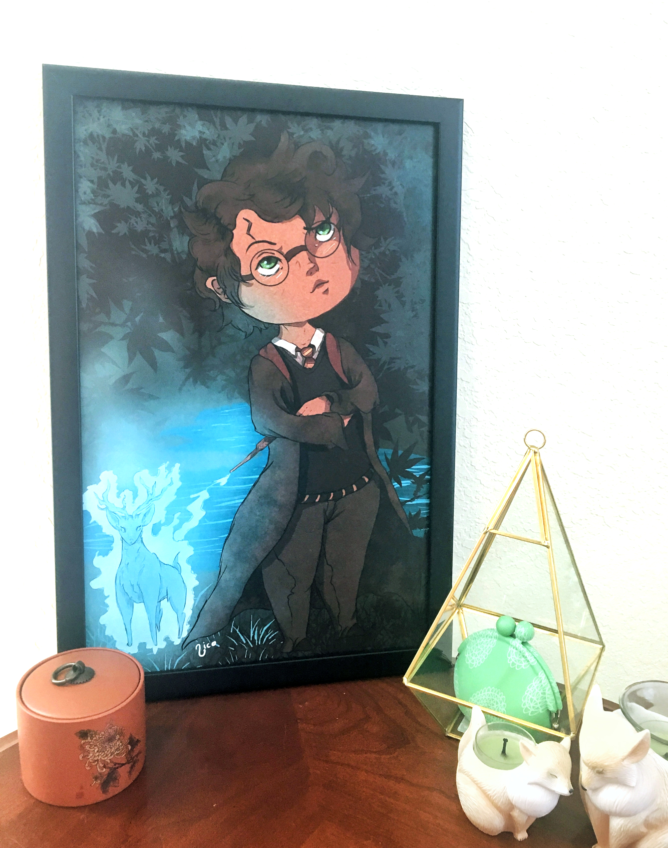 Harry and his stag patronus deep in the forbidden forest. Done in colors to match Draco as a pair.