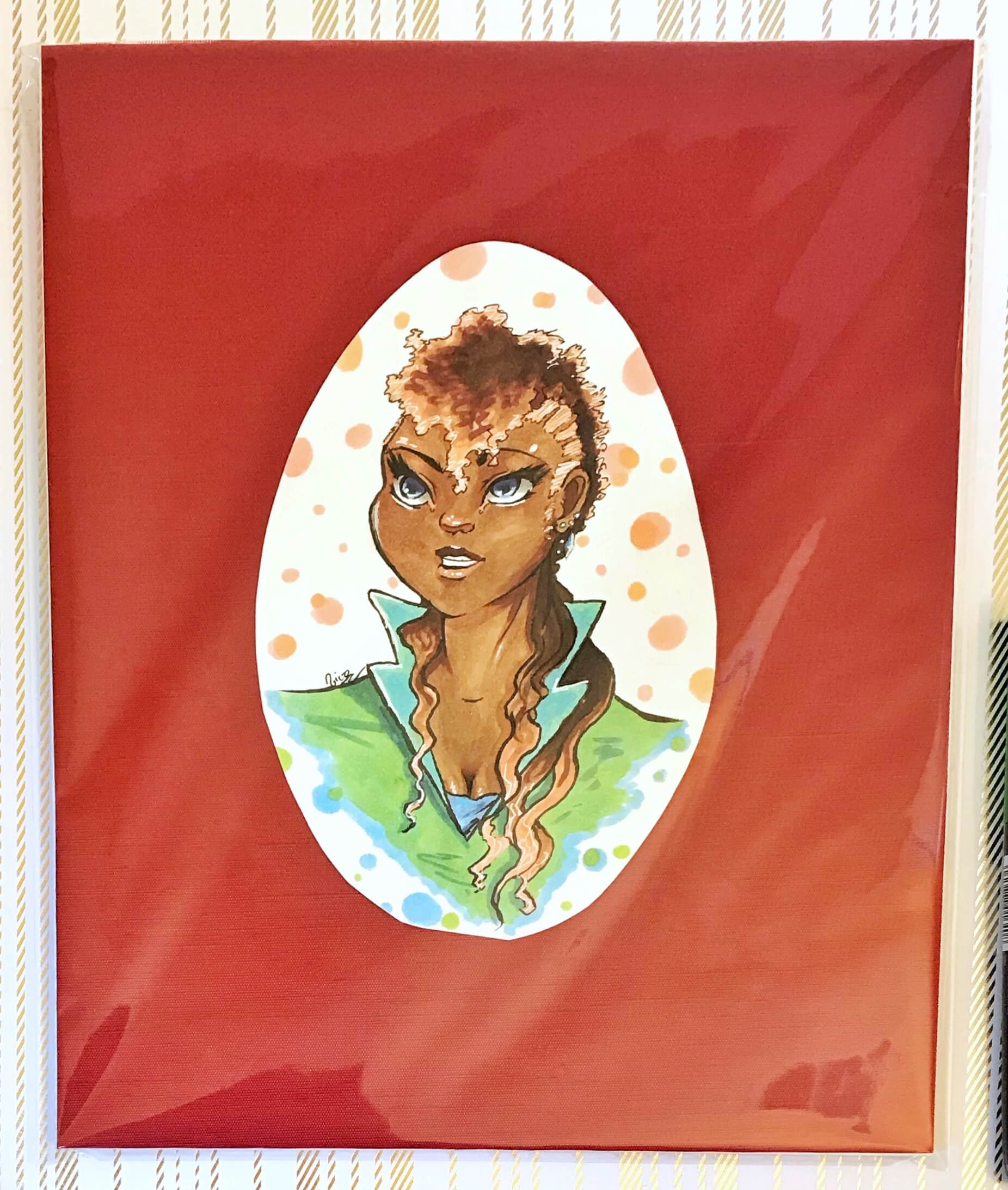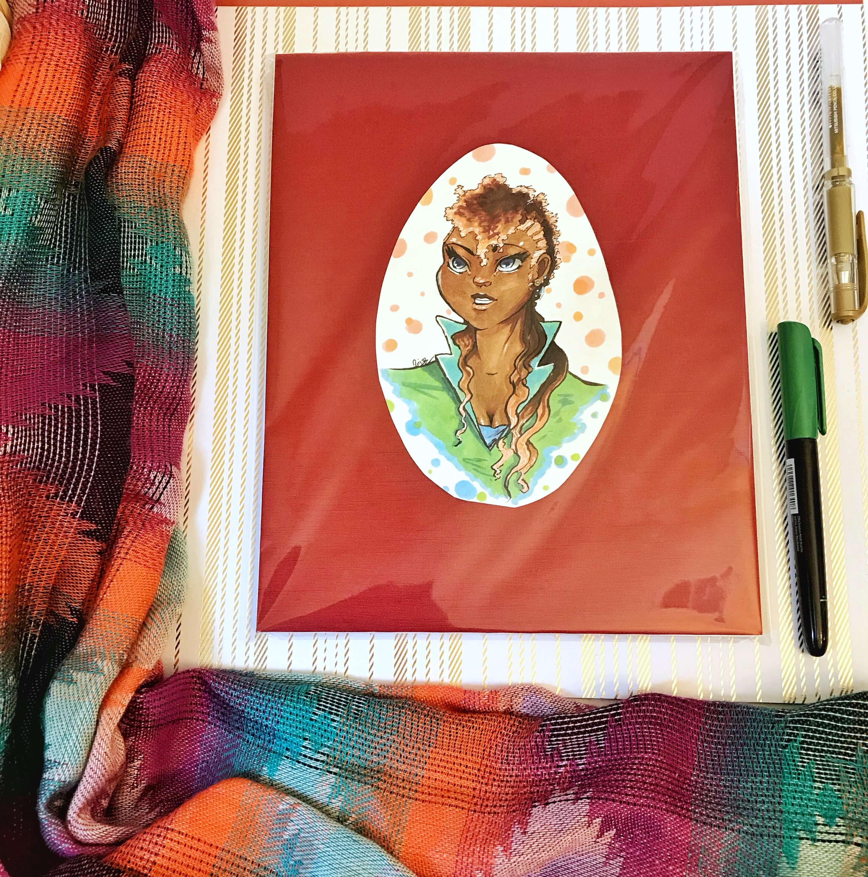 Copic marker and multi-liner on oval cut Strathmore sketch paper. Signed. Sealed in a plastic slip. Original traditionally drawn piece.