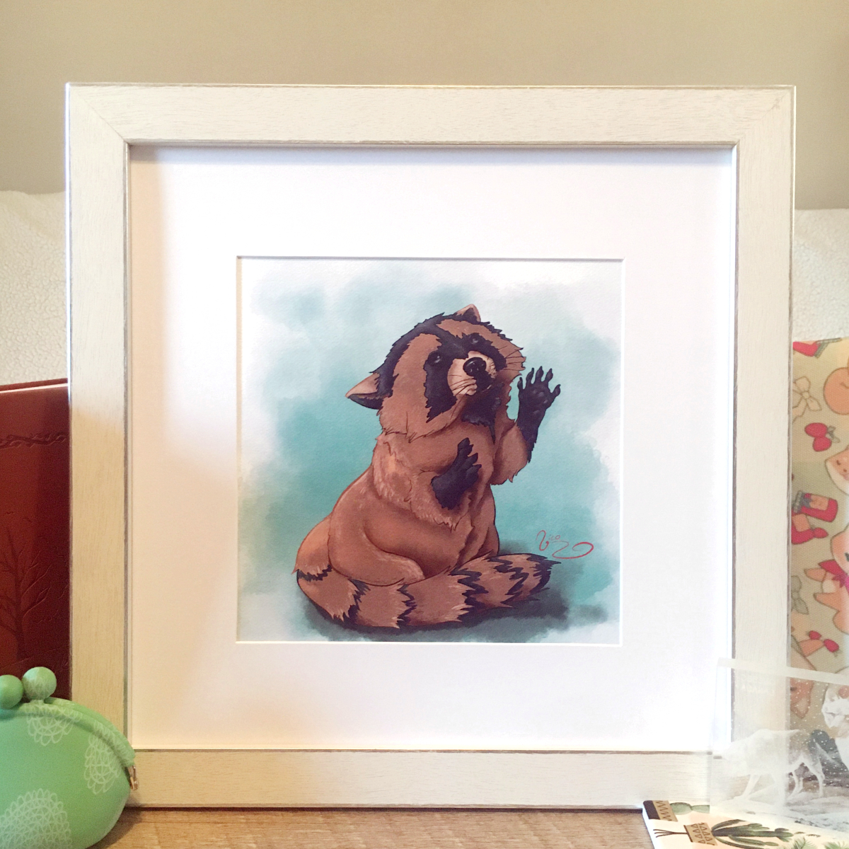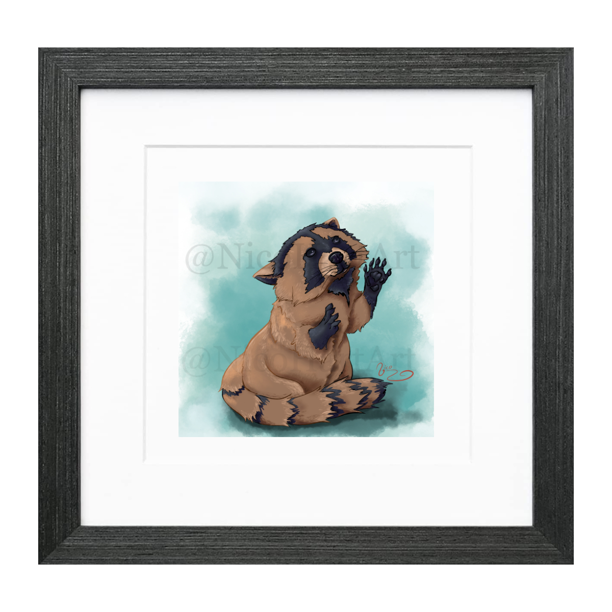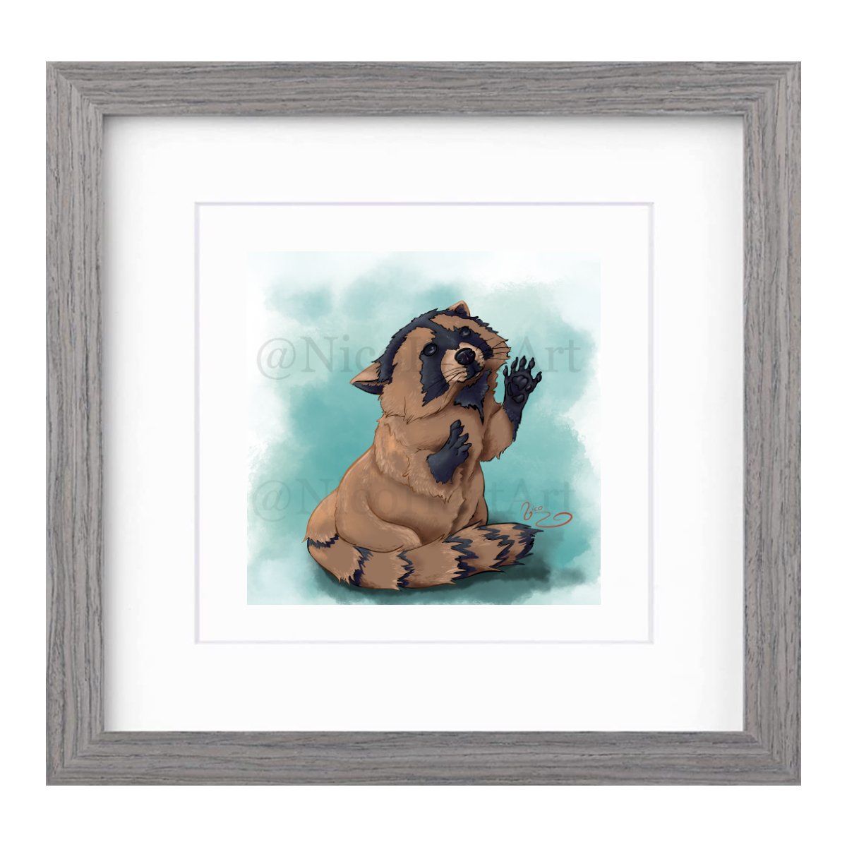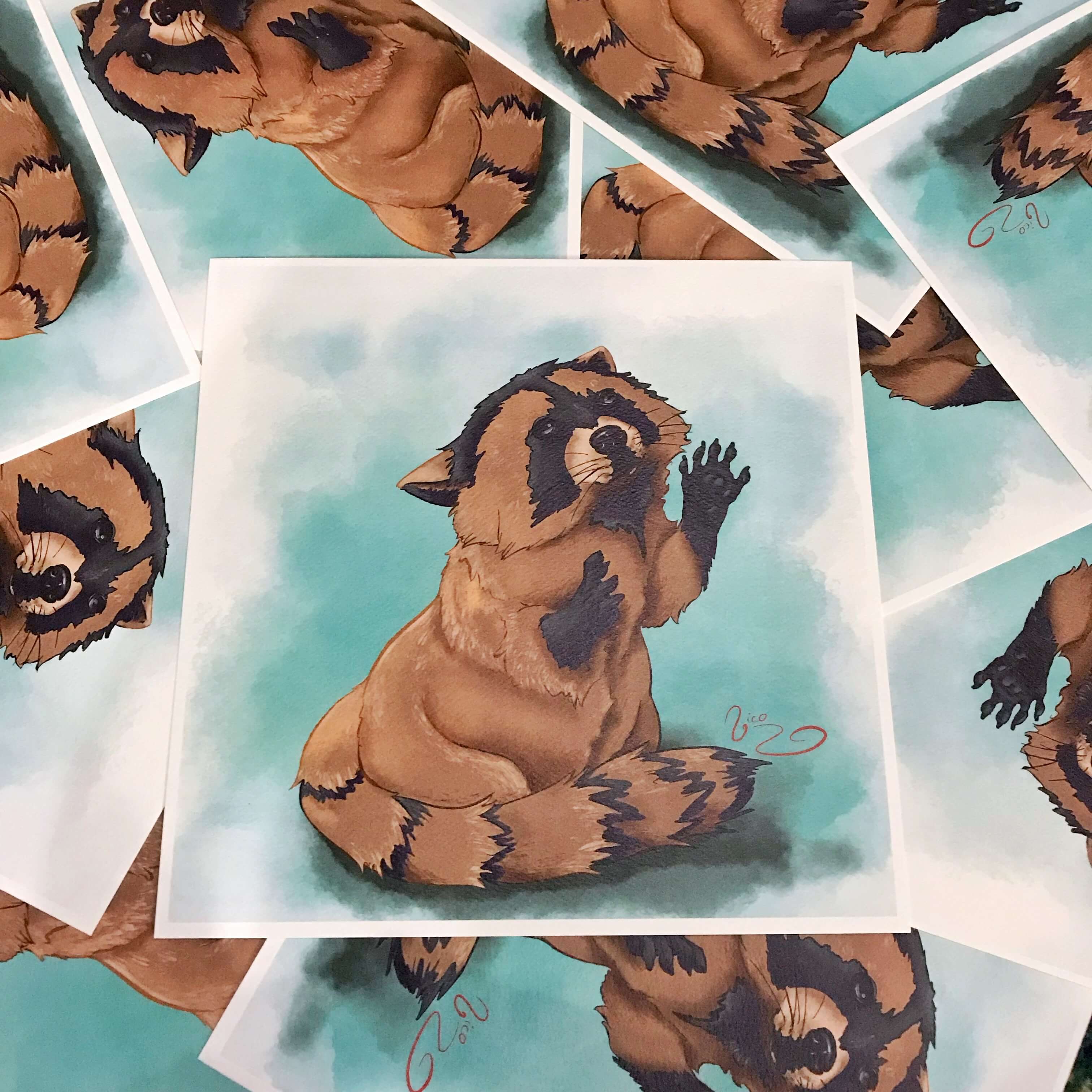 Cute Raccoon Illustration with watercolor texture on 100lb matte finish felt / watercolor cardstock paper. High-quality non-archival prints.