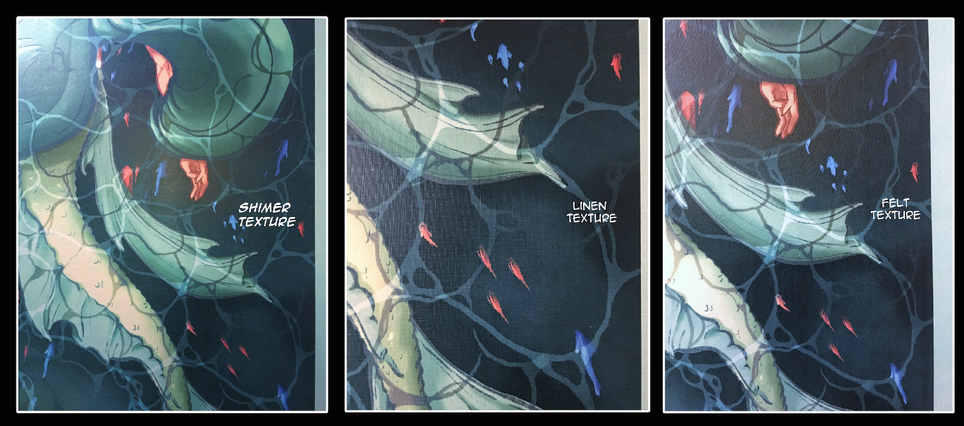 -Shimmer: (labeled as default/availability in options) slightly darker whites with a cool shimmer effect similar to water or the surface of wet fish scales. It is hard to see in the photo. Heavy Cardstock.