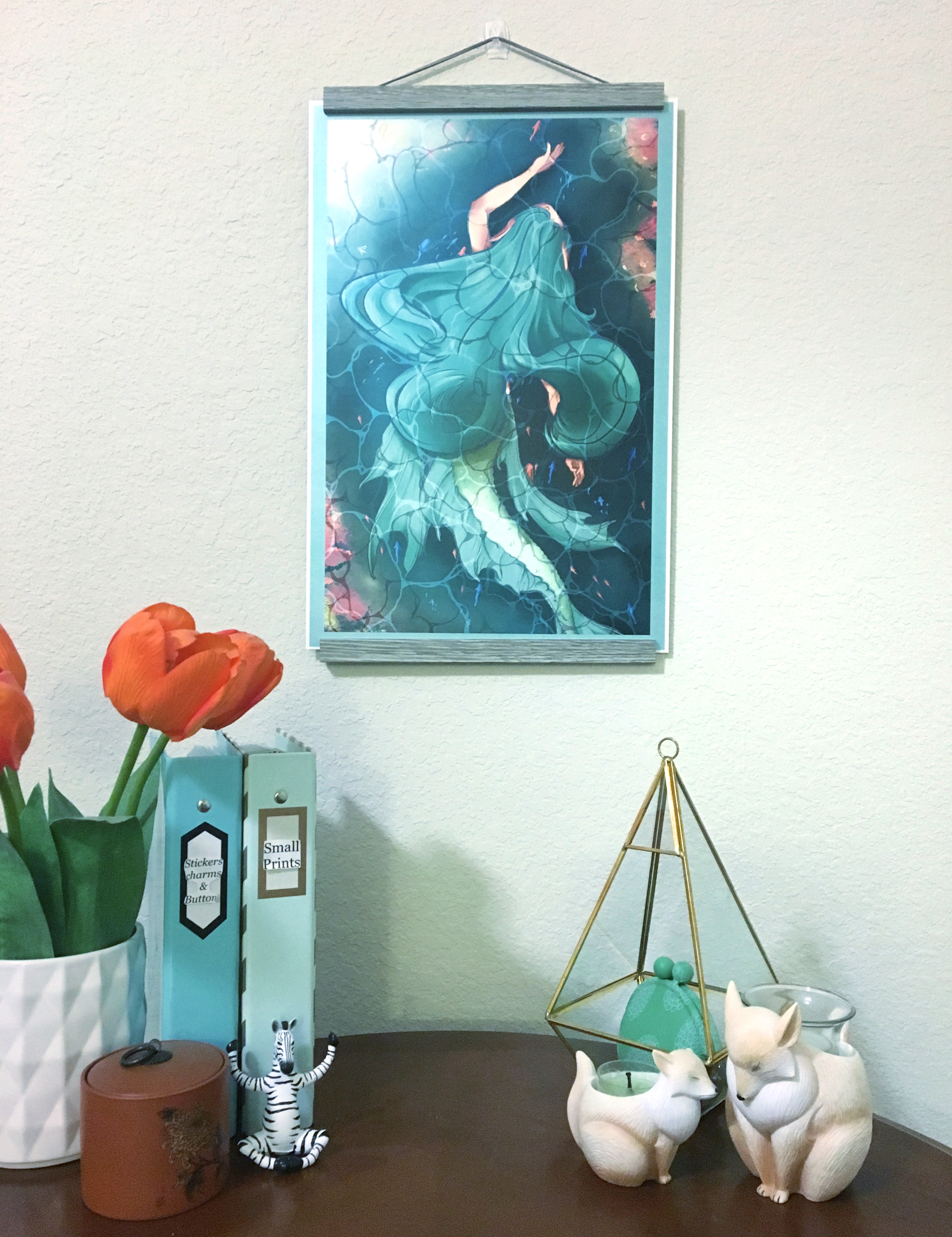 1" white borders to help with framing with an additional teal border. Total size 12x18.