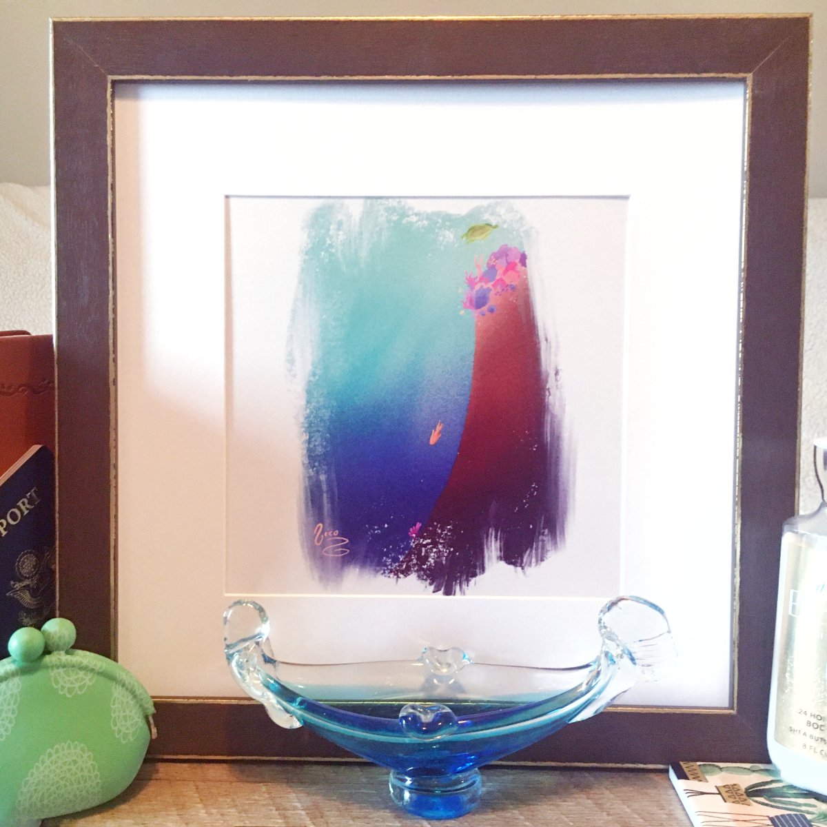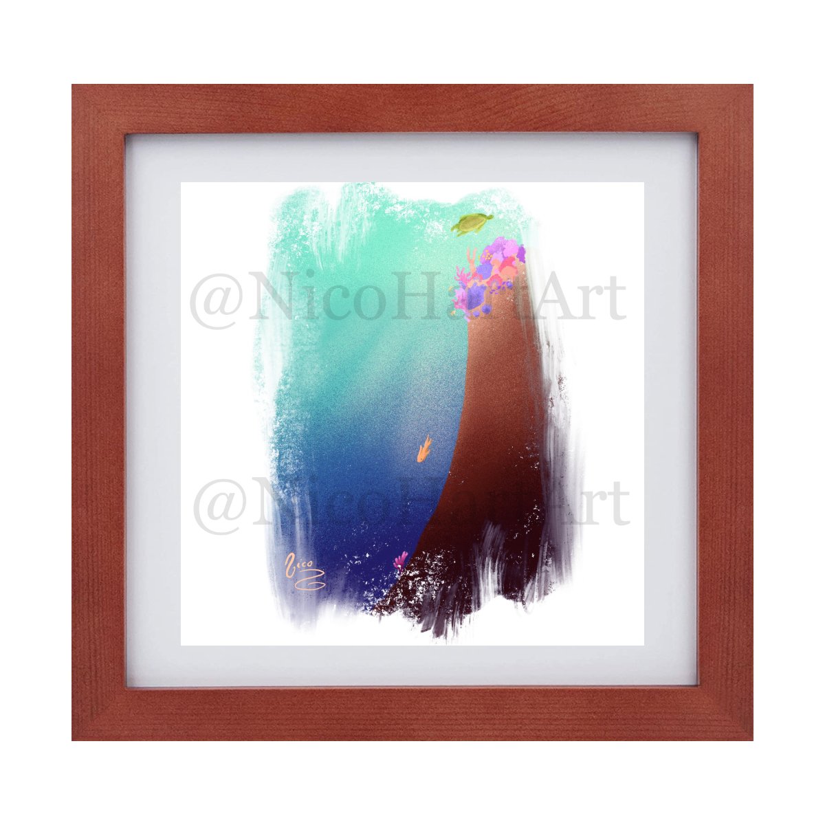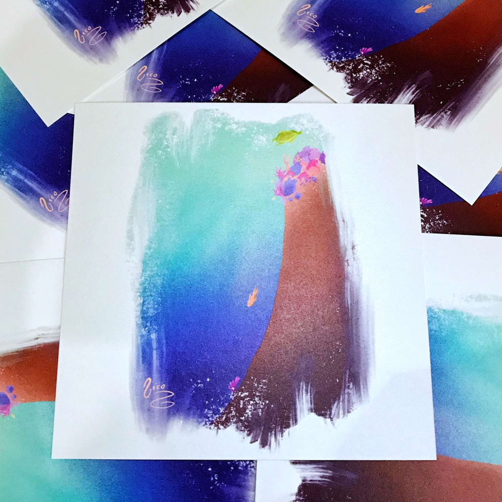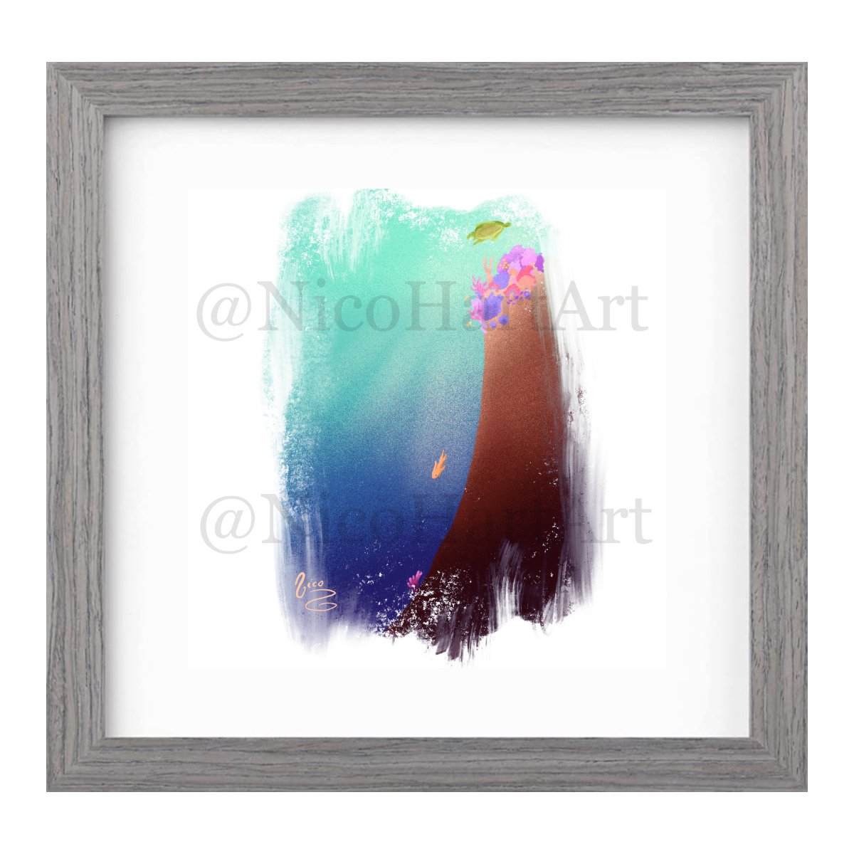 Contemporary textured illustration of a fish's deep dive of exploration on shimmer textured 107lb cardstock paper. High-quality non-archival prints.