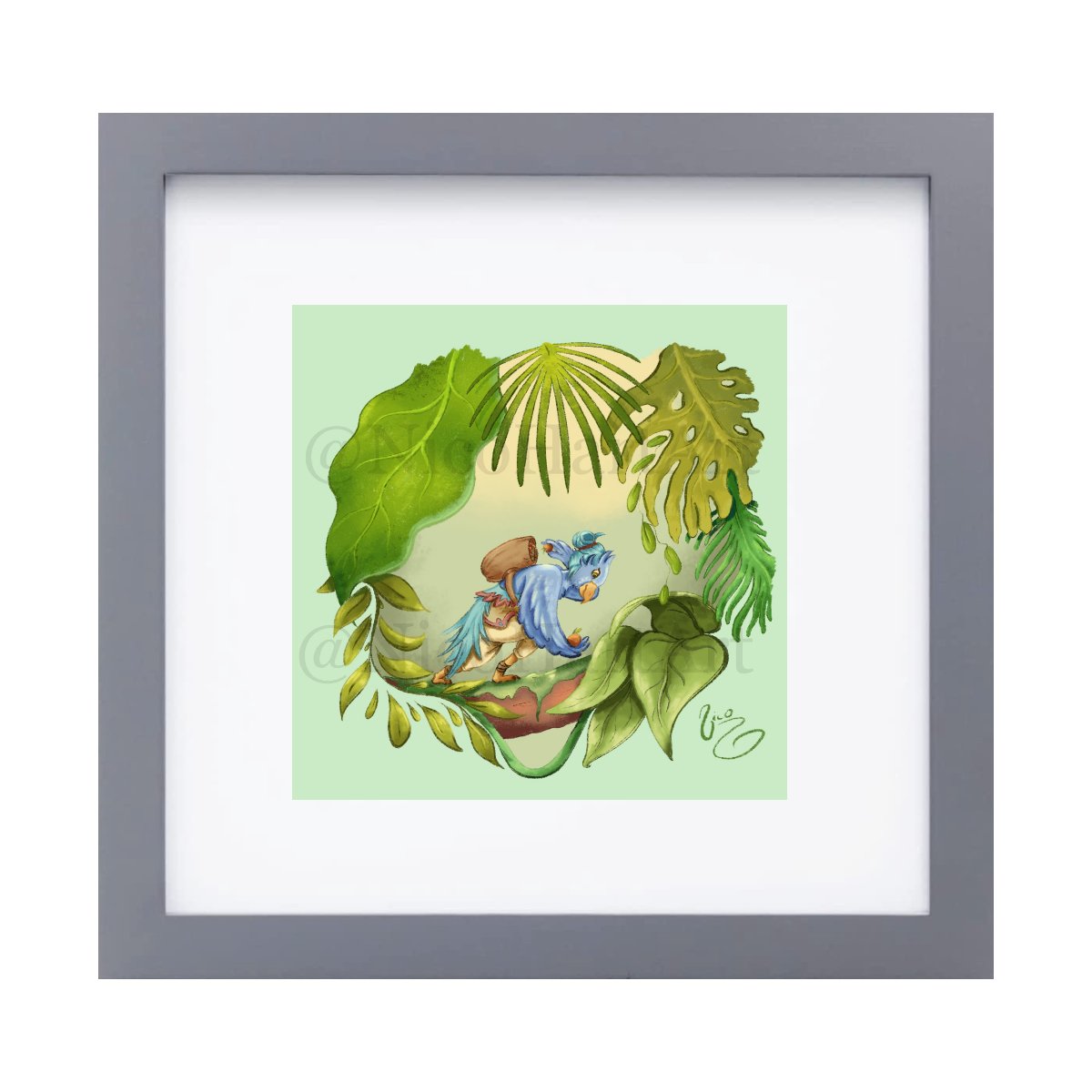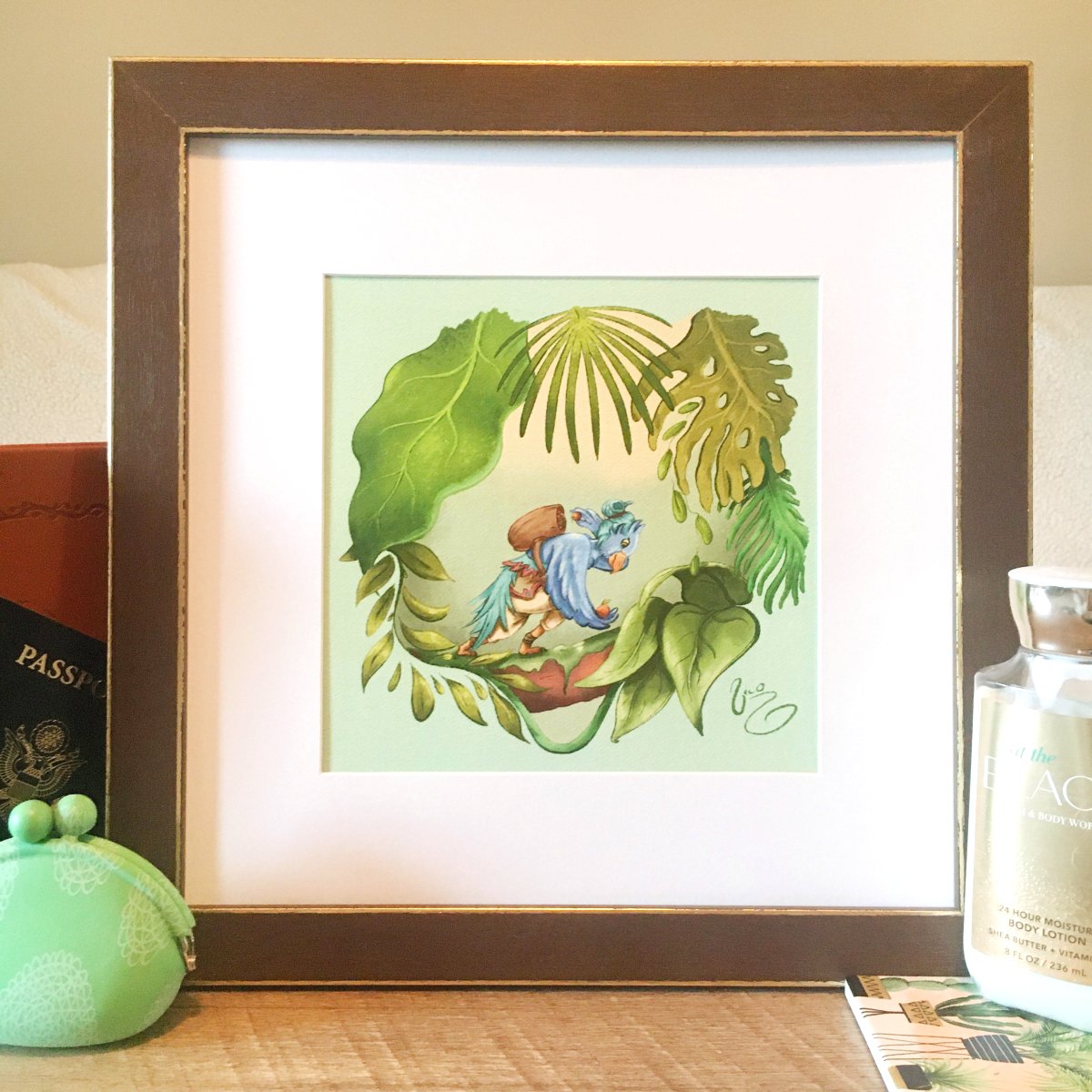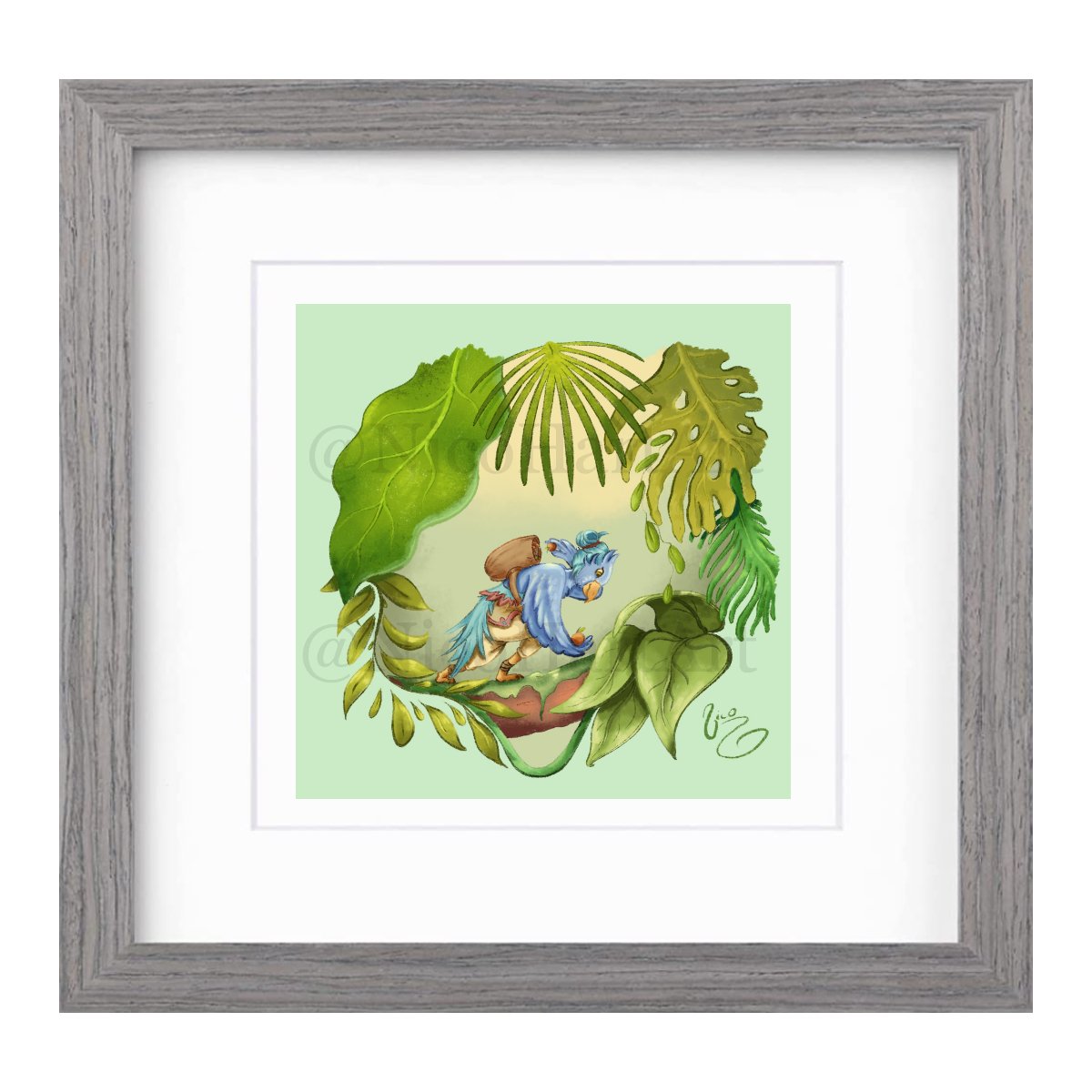 Illustration on felt / watercolor textured 100lb cardstock paper. High-quality non-archival prints. 1" white borders to help with framing. Total size 8x8"