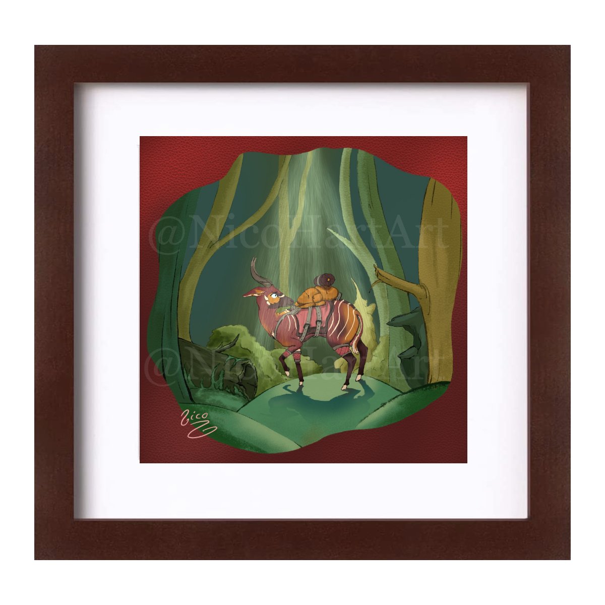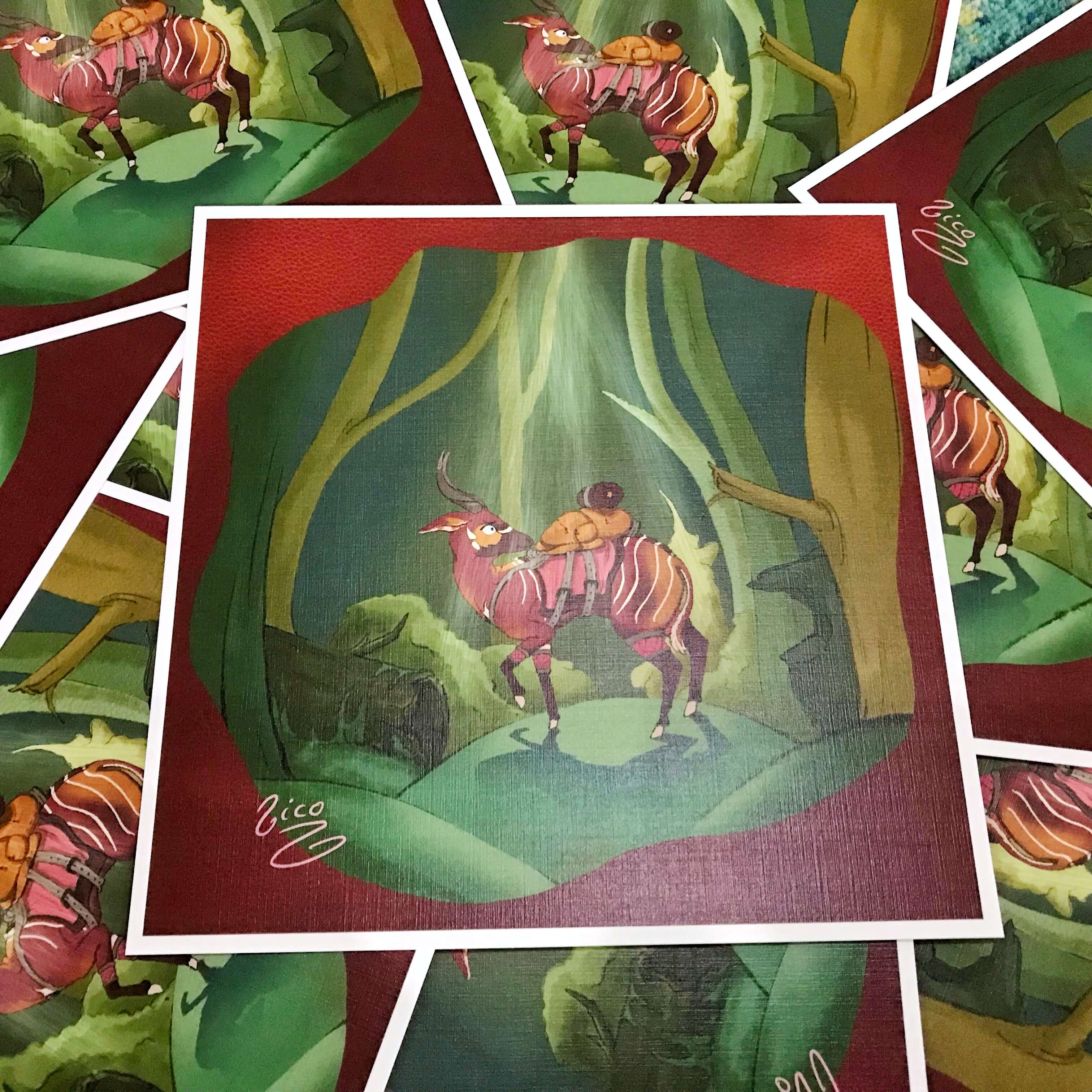 Illustration on linen-textured 130lb cardstock paper. High-quality non-archival prints. 1" white borders to help with framing. Total size 8x8"